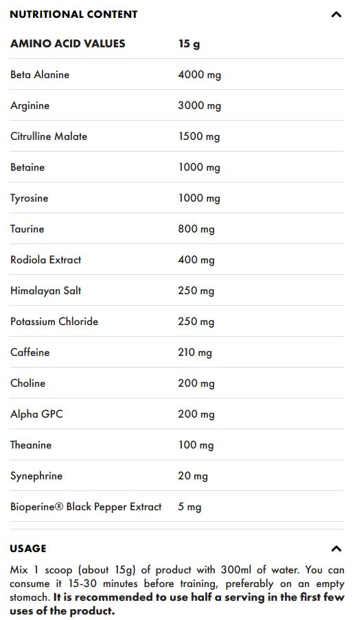 It has Betaine, Beta Alanine, Arginine, Citrulline Malate content.